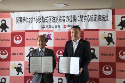 常陸太田市と㈱デベロップによる、災害時における移動式宿泊施設等の提供に関する協定の締結式を常陸太田市役所にて開催しました。