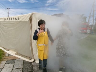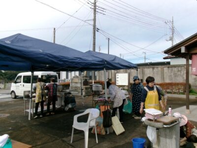 女性チームは炊き出しの訓練も兼ねて、野外での昼食づくりを担当し、