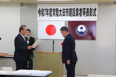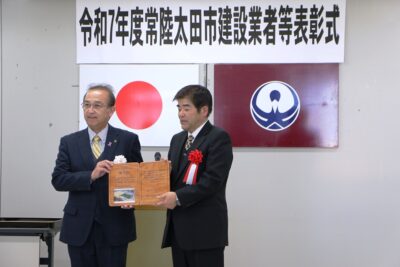 令和7年度常陸太田市建設業者等表彰式が市役所にて開催され、建設業者部門に、町田運動公園整備工事を施工した、オカベ・根本特定建設工事共同企業体の代表構成員の株式会社オカベ様と、構成員の株式会社根本工務所様、