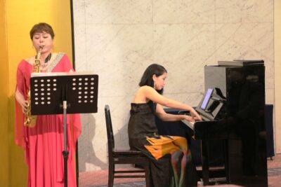 総会後の懇親会では、同窓生で世界的に活躍されているサクソフォニストの塙美里さんによる、ピアノとのアンサンブル演奏が披露されました。