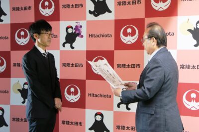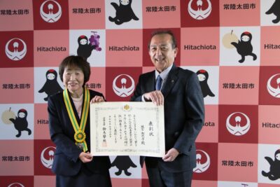 また、「社会を明るくする運動」へ協力した団体として、特にその功績が顕著であることから「かわねやフェスタ店」に、茨城県知事か感謝状が贈られ、市役所において知事に代わり記念品と共に授与致しました。