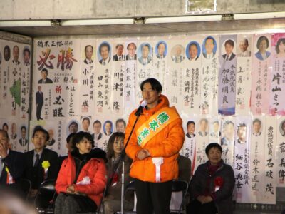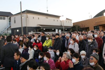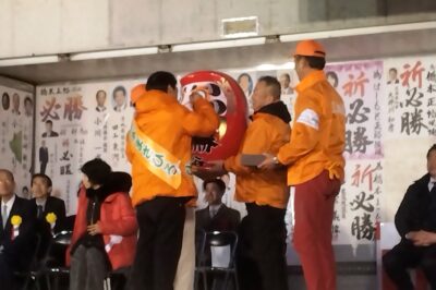 17時から出陣式が開かれると、すぐに無投票当選の一報が入り祝勝会に切り替えられ万歳三唱が行われました。た。