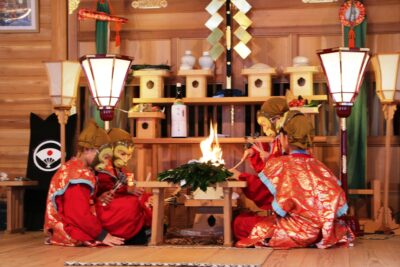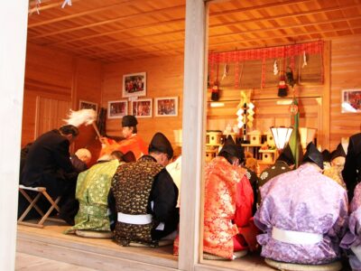 境内では氏子や参拝客の皆さんで賑わいを見せる中、田楽堂では神事が斎行され、