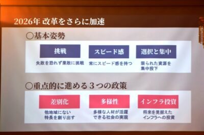 知事はこれまでも「挑戦」「スピード感」「選択と集中」の基本姿勢を大切に県政を運営しており、今後は「差別化」「多様性」「インフラ投資」の3つを重点的に進めていきたいと話していました。