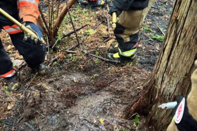 地上から燃え止まり箇所の確認やスコップによる土かけ、ジェットシューターを使った消火活動などを約130名態勢で実施しました。