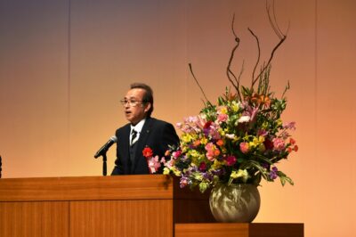 大井川知事や下路県議会副議長に続いて、県内市町村長を代表してのお祝いの言葉を述べさせて頂きました。