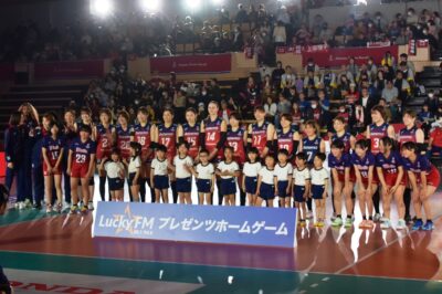 Lucky FMの煙山アナと始球式まで行わせて頂き、2週間前に地元ママさんバレーボールチーム「幸久クラブ」の特訓を受けた甲斐もあって、無事に1発で相手コート内にサーブすることが出来ました。