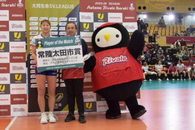午後からは、昨年10月に常陸太田市とフレンドリータウン協定を締結したAstemoリヴァーレ茨城のSVリーグ公式戦が日立市のさくらアリーナで開催され、本日初めて「常陸太田市の日」としてのホームゲームとあって、市のPRブースを設け、イチゴやチーズなどの特産品の販売や観光案内などを実施しました。