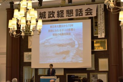 今回は、東北大学災害科学国際研究所の遠田晋次教授を講師に招いて、「東日本大震災から15年 長期にわたる3.11の影響と関東の地震危険度」と題した講話が約1時間半にわたり行われました。
