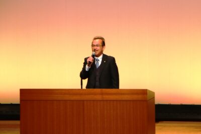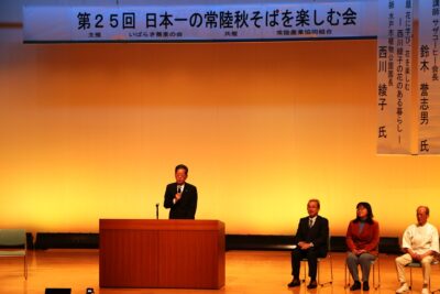 来賓を代表して、四半世紀にわたり常陸秋そばの魅力を発信し続けてこられた関係者の皆さんに敬意を表しますと共に、本市の赤土町で栽培されていた在来種を育成選抜し、昭和60年に茨城県の奨励品種として誕生した「常陸秋そば」が、全国のそば職人から玄そばの最高峰と評価されるなど、豊かな香りと風味、そして噛むほどに広がる甘みは、まさに日本一のブランドにふさわしい味わいであり、本市を代表する特産物である旨、ほぼ市外から来場された200名強の皆さんに、ご挨拶を申し上げました。