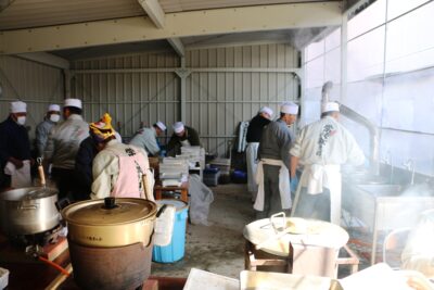 屋外では早朝から、主催者の皆さんによる昼食用の常陸秋そばの準備が進められ、