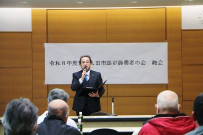 来賓として招待頂き、地域農業の担い手として農業行政はもとより市政全般にご支援・ご協力頂いている会員の皆さんに感謝の意と併せて、農業従事者の高齢化や後継者不足による離農者の増加、遊休農地が増えるなど農業を取り巻く環境が厳しい状況ではありますが、引き続き農地の維持等へのご理解・ご協力をお願いしたい旨、祝辞を述べさせて頂きました。