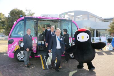 また式典終了後は、国のモデル地区に指定され実証陣中の自動運転EVバス「じょっぴー」の展示を見学していて抱くなど、本市の取組をPRさせて頂きました。