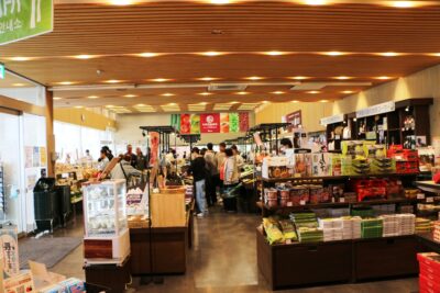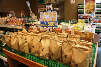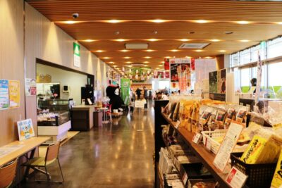 店内の直売所コーナーでは、旬の朝採り野菜や地域の特産品が並べられ、