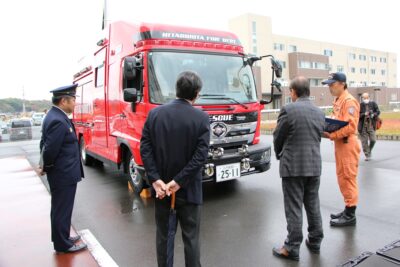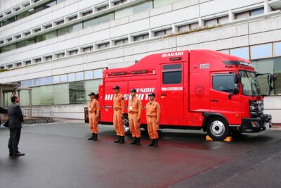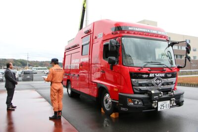今月、常陸太田市消防本部に新たな大型救助工作車が納品され、市役所駐車場の一角でお披露目が行われました。