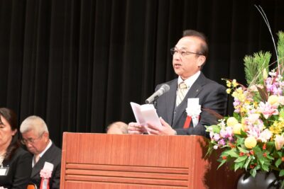 贈呈式終了後は、来賓を代表して、ご参列いだたいた教育関係者、児童生徒、市民の皆さんに本市の教育振興のためにご尽力頂いていることに感謝の意を伝えると共に、新総合体育館や小中学校のICT環境整備の進捗状況や、令和8年度からの中学生の修学旅行と小中学校の給食費無償化の実施に向け、現在準備を進めている旨、報告させて頂きました。